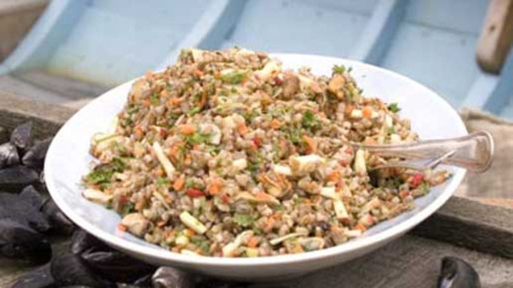 Avaa osterit ja tarkista, että ovat käyttökelpoisia. Paloittele osterit suurehkoiksi paloiksi ja lisää ohrasalaattiin yhdessä ostereiden mehun kanssa. Lisää kokonaiset simpukat. Lisää hienonnettu kirveli ja pihlajanmarjasose varovaisesti salaattiin ja sekoita kaikki aineet hyvin keskenään. Voit maustaa salaatin halutessasi myös tilkalla hunajaa ja omenaviinietikkaa.