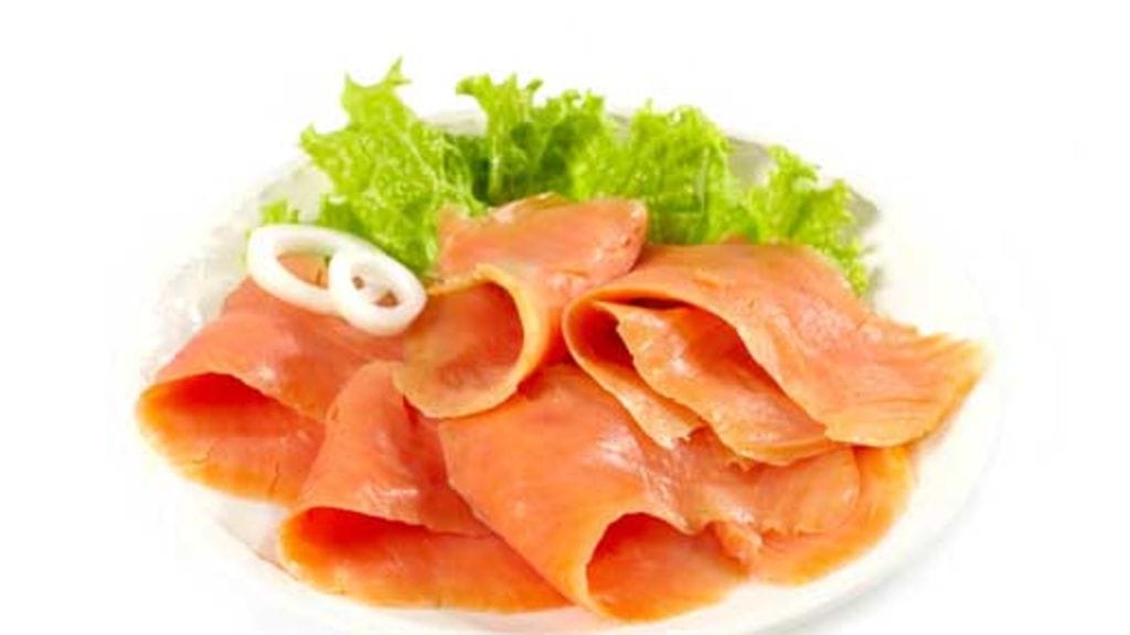 3. Kuumenna uuni 175 asteeseen. Lämmitä lautasia uunissa viisi minuuttia. Levitä lohiviipaleet kuumille lautasille. Ripottele päälle suolaa ja rouhittua mustapippuria. Nosta omenasalaatti lautasille ja valuta rucolaöljy. Tarjoile heti.
