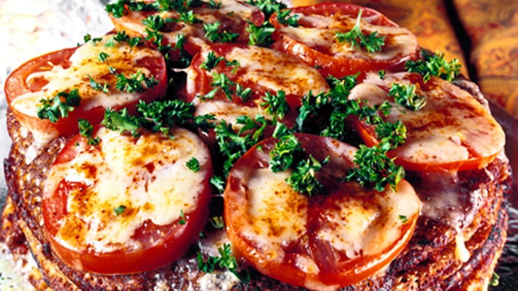 6. Peitä ylimmät ohukaiset tomaatilla ja juustolla, gratinoi uunissa kunnes juusto on sulanut.