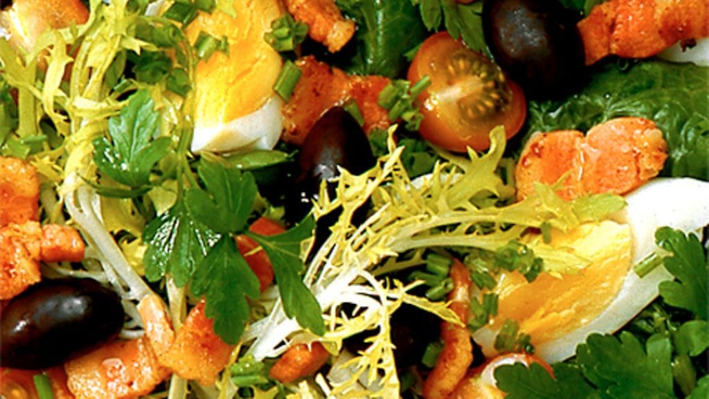 3. Hienonna ruohosipuli ja poista persiljasta varret. Asettele munalohkot, tomaatinpuolikkaat, oliivit ja porsaansuikaleet kauniisti salaattipedille. Pirskottele päälle kastiketta ja koristele ruohosipulilla ja persiljalla. Tarjoa heti, etteivät porsaansuikaleet ehdi jäähtyä.