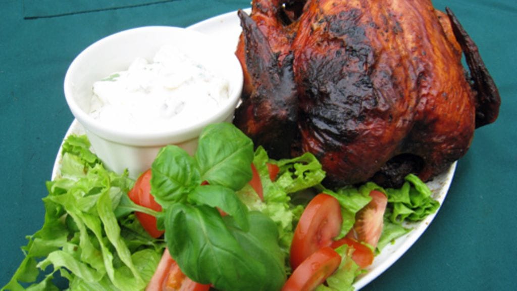 Kuumenna grilli ja nosta broileri, olutastioineen ritilän päälle. Kypsennä tunnin verran grillikuvun alla. Tähän voi käyttää kaasu- tai pallogrilliä.