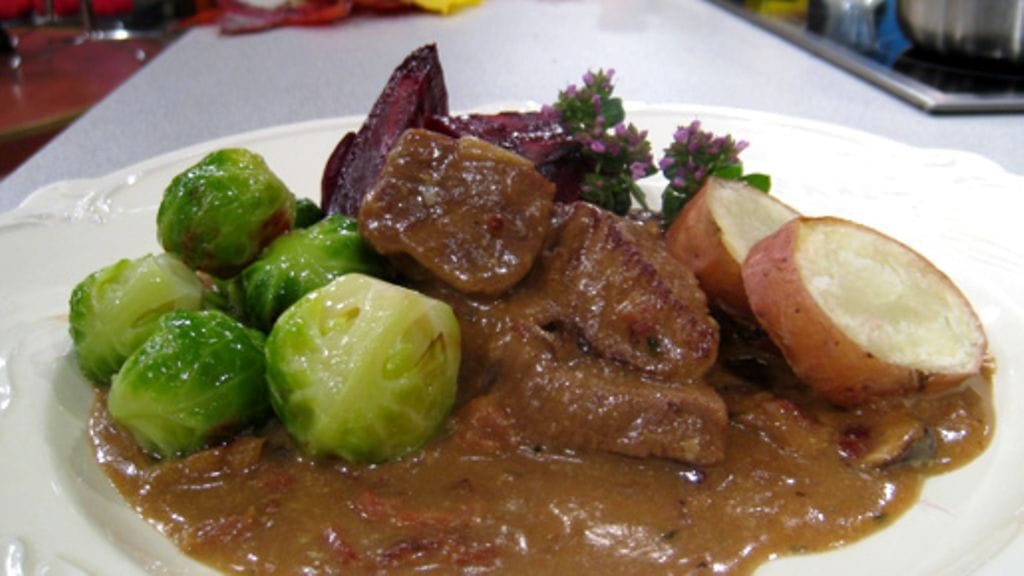 Ruskista sipulit sekä sienet ja lisää joukkoon loput aineet. Hauduta kannen alla kypsäksi joko liedellä tai uunissa. Liha kypsyy raaka-kypsyydestä ja kuution koosta riippuen noin puolestatoista tunnista kahteen tuntiin.