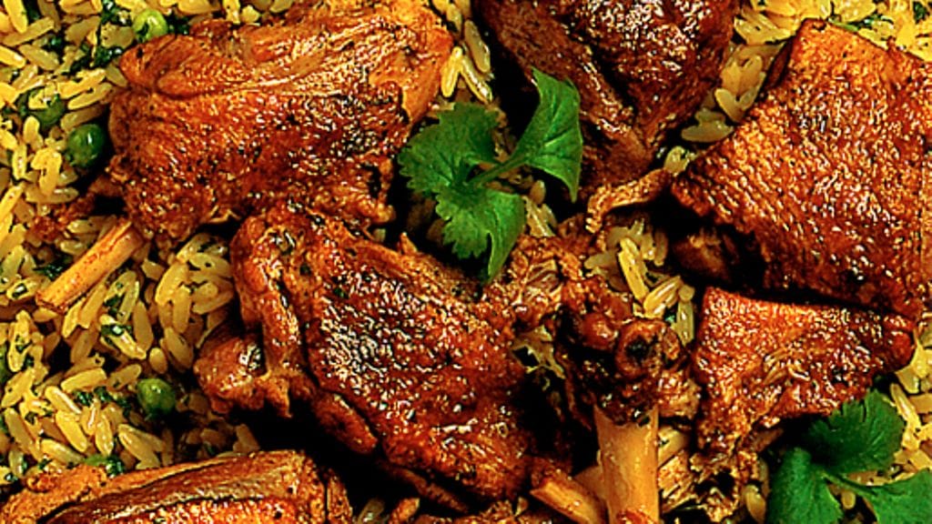 3. Siivilöi liemi, kuori osa rasvasta pois ja lisää tarvittaessa vettä niin että saat 8 ½ dl lientä. Kuumenna kiehuvaksi, lisää riisi ja keitä kannen alla miedolla lämmöllä n. 20 minuuttia kunnes kaikki neste on imeytynyt riisiin. Lisää korianteri, herneet, ½ tl suolaa ja ½ maustemittaa pippuria. Lisää ankanpalat riisin päälle ja anna levätä muutama minuutti kannen alla miedolla lämmöllä jotta kaikki on yhtä lämmintä tarjoiltaessa.