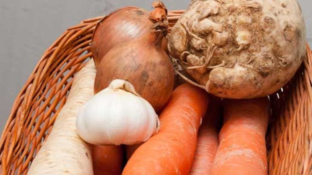 1. Ryöppää ja kuori sipulit. Paloittele selleri 5 cm pituisiksi paloiksi, murskaa valkosipuli, kuori porkkanat. Kuumenna oliiviöljy isossa paistinpannussa, paista sipuleita ja selleriä keskilämmöllä kunnes ne ovat kauniin värisiä, 10-12 minuuttia.