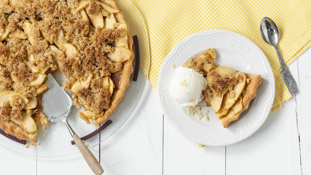 Levitä omenat piirasvuoan pohjalle. Sekoita pehmeän voin joukkoon kaurahiutaleet, sokeri, kookoshiutaleet ja vaniljasokeri. Ripottele muruseos piiraan päälle.