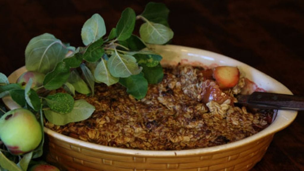 Sulata rasva ja lisää fariinisokeri, kaurahiutaleet sekä vehnäjauhot. Levitä seos omenalohkojen päälle. Kypsennä 200-asteisen uunin alatasolla noin puoli tuntia. Tarjoa (vaahdotetun) vaniljakastikkeen tai jäätelön kanssa.