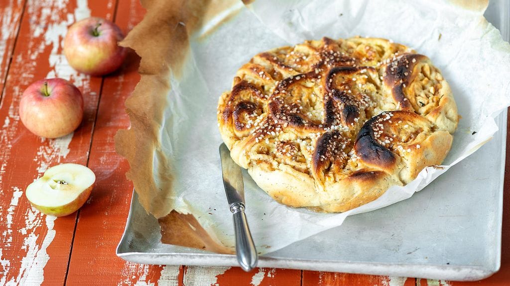 Vaivaa taikinasta ilmakuplat ja kaulitse leivinalustalla ohueksi suorakaiteen muotoiseksi levyksi. Levitä pinnalle vaniljakreemi ja ripottele pinnalle omenakuutiot. Kääri tiukahkolle rullalle ja leikkaa noin 4 cm paksuiksi viipaleiksi. Vuoraa halkaisijaltaan 24 cm kakkuvuoka leivinpaperilla ja nosta pullat vuokaan leikkauspinta ylöspäin. Anna kohota lämpimässä paikassa liinan alla ja voitele munalla. Ripottele pinnalle raesokeria.