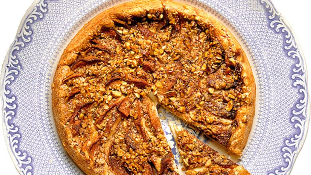 2. Kuori ja lohko omenat ja poista siemenkodat. Levitä omenalohkot vuokaan taikinan päälle. Ripottele pinnalle pähkinärouhe sekä hieman kanelia ja sokeria. Paista uunissa 40-45 minuuttia.