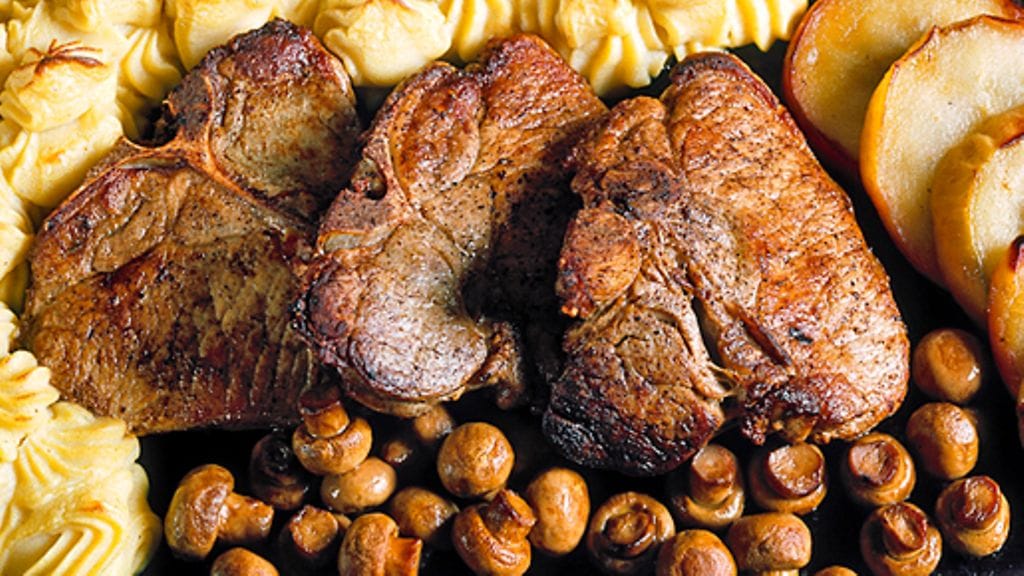 2. Paista sieniä ja omenasiivuja pannulla ja nosta ne kyljysten viereen.