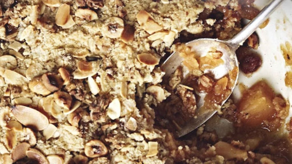 3. Aloita kuorrutteen tekeminen laittamalla jauhot, sokeri, voi ja kaneli kulhoon ja hieromalla seosta sormenpäillä, kunnes sen rakenne vastaa leivänmuruja. Lisää granola ja sekoita hyvin.