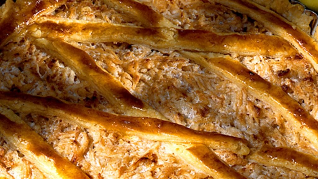 4. Ripottele mantelimassa piiraskuoren pohjalle. Levitä täyte sen päälle. Kaulitse ylijäämätaikina, ota siitä suikaleita taikinapyörällä ja koristele torttu. Penslaa kananmunalla.