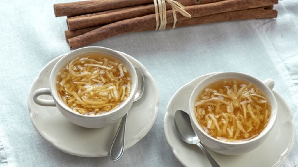 Mittaa omenamehu, perunajauhot ja sokeri kattilaan. Lisää myös ripaus kanelia tai kanelitanko.
