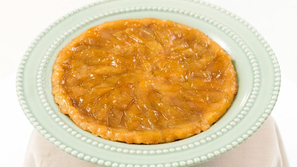 4. Kauli pohja pyöreäksi ja asettele päällimmäiseksi vuokaan. Rei’itä pohjaa. Paista 175˚C 35-45min. Anna jäähtyä muutama minuutti ja kumoa nurinpäin tarjoilualustalle. Lämmitä aprikoosihillo ja sivele piirakan päälle.