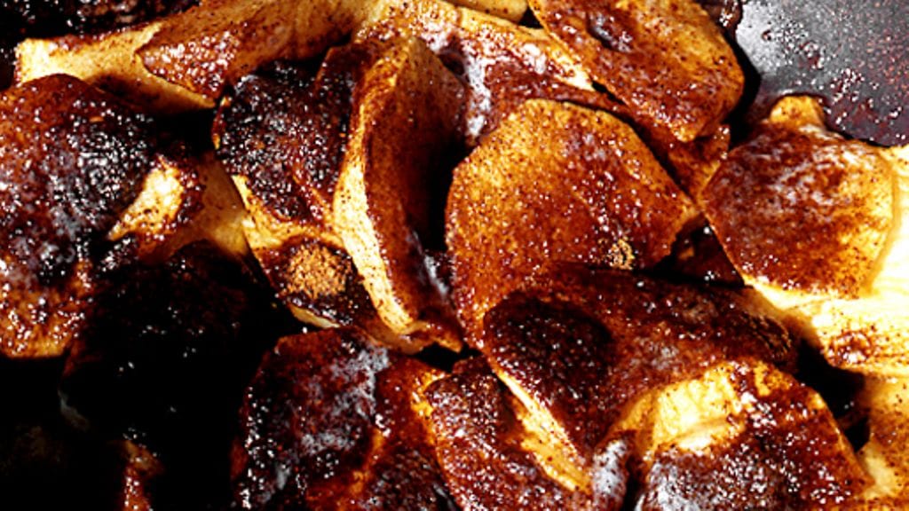 2. Laita vuoka korkealle uuniin kunnes voi on sulanut ja omenat pehmenneet. Ota uunista, laita päälle nokare jäätelöä ja syö heti.
