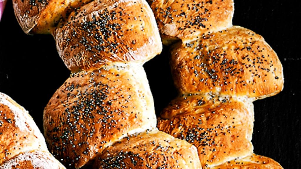 3. Penslaa pitkot vatkatulla munalla, sirottele pinnalle unikonsiemeniä ja paista uunin keskitasolla noin 15 minuuttia. Jäähdytä ritilällä.