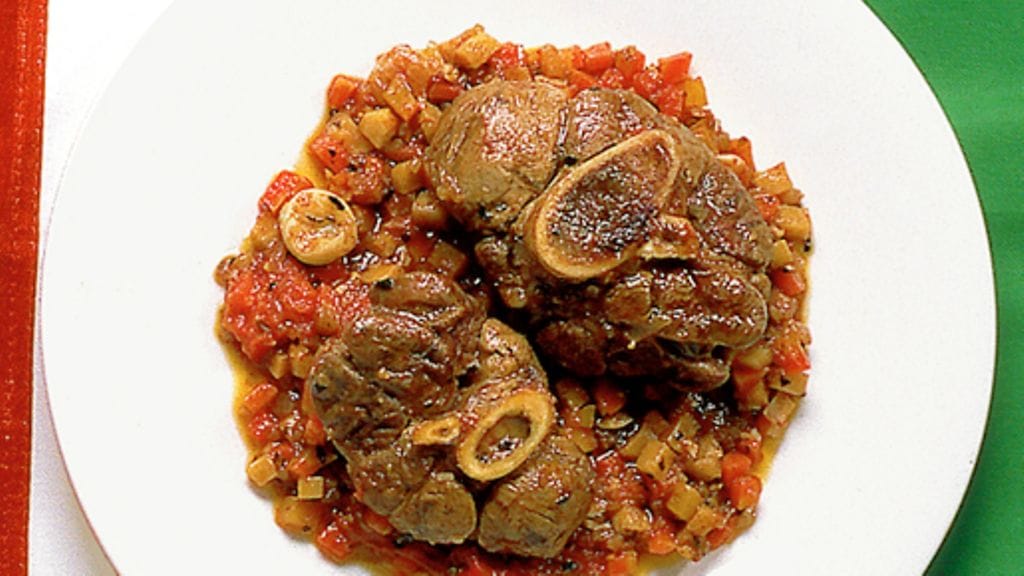 2. Sulata 75 g voita isossa padassa. Paista siinä sipuli, porkkana, juuriselleri ja hienonnettu valkosipuli. Kaada päälle viini ja anna kiehua kokoon. Lisää liemi, puolen sitruunan mehu, meirami ja tomaatit. Mausta suolalla ja pippurilla. Lisää lihaviipaleet. Anna kiehua hiljaa 1-1 ½ tuntia tai kunnes liha irtoaa luista. Purista mukaan vielä yksi valkosipulinkynsi. Keitä vielä 5 minuuttia.