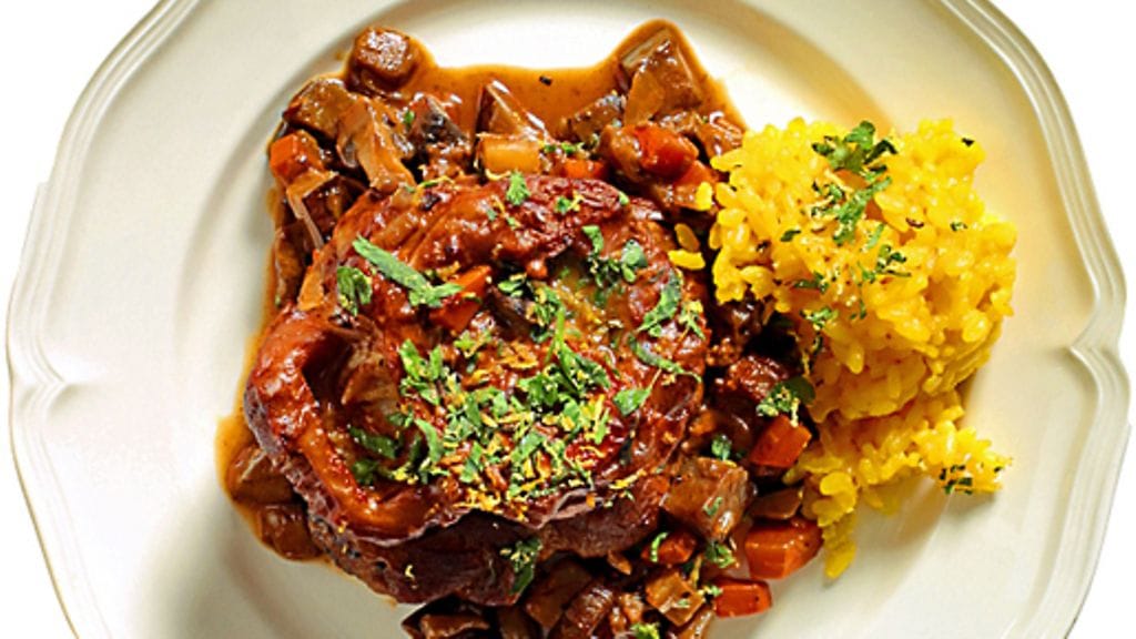 1. Puhdista, kuori ja kuutioi porkkana, munakoiso, juuriselleri ja sipuli. Leivitä osso bucco vehnäjauhossa ja ruskista voissa padassa. Lisää joukkoon sipuli, porkkana, juuriselleri ja munakoiso ja paista, kunnes ne saavat hieman väriä.
