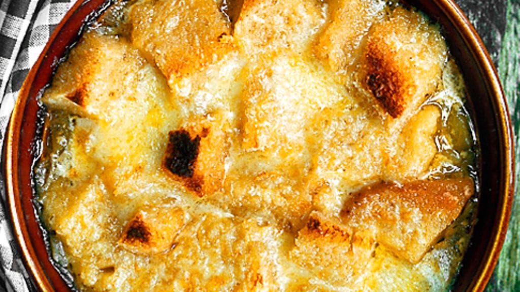 3. Kuumenna uuni 250 asteeseen. Jaa soppa uuninkestäville lautasille. Paloittele leipäviipaleet ja laita ne keiton päälle. Ripottele päälle juustoa, gratinoi uunissa.