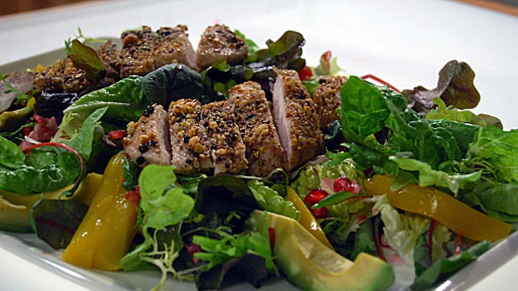 Aloita salaatin valmistus maustamalla ja kypsentämällä broilerin fileet. Mausta fileet suolalla ja anna maustua hetki. Murskaa sillä aikaa pähkinät ja viispippuriseos hienoksi tehosekoittimessa tai muovipussissa kaulimen avulla ja kaada seos lautaselle. Kaada kevyesti öljyä fileiden pintaan ja pyörittele ne pähkinämausteseoksessa. Kuumenna paistinpannu ja paista nopeasti väri fileisiin. Nosta ne uunivuokaan ja kypsennä mehukkaan kypsäksi uunissa 175 asteessa 20 minuutin ajan.