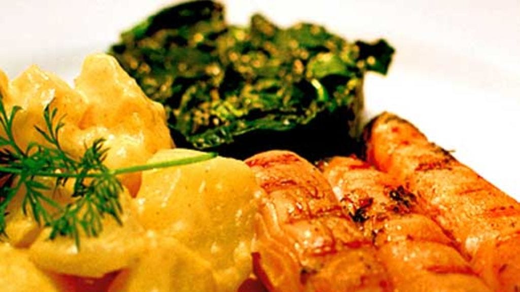 2. Keitä perunat kypsiksi suolavedessä muutamia tillinoksia mukanaan. Keitä kermaa kokoon, niin että puolet on jäljellä. Vatkaa yhteen sinappi, sokeri ja viinietikka. Lisää öljy tipoittain ja vatkaten. Sekoita sinappikastike kermaan ja mausta suolalla ja pippurilla. Kääntele perunat kastikkeeseen ja pidä lämpimänä, mutta älä anna kiehua enää.