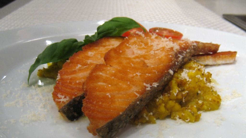 Kuumenna kalalientä ja lisää sitä ohrarisottoon vähitellen kunnes ohra on kypsää. Raasta parmesania joukkoon ja notkista lopuksi kermalla. Nosta kattila sivuun hellalta ja viimeistele risotto basilikalla.