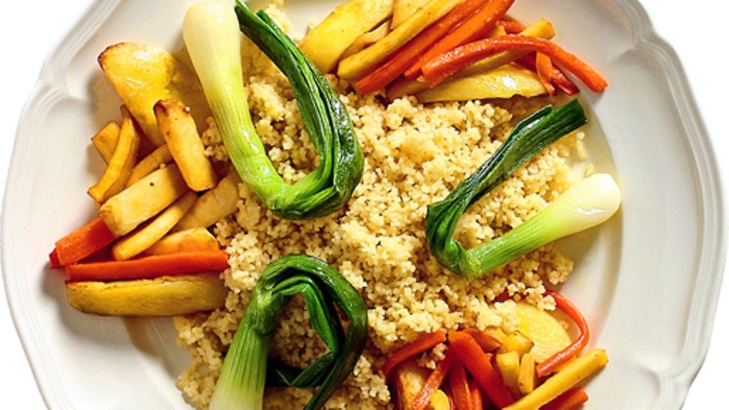 2. Kiehauta kasvisliemi ja kaada se couscous-suurimoiden päälle. Anna turvota kannen alla 5 minuuttia. Lisää suurimoiden joukkoon voi ja sekoita haarukalla ilmavaksi.
