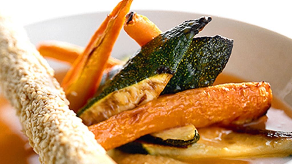 2. Leikkaa kesäkurpitsa tangoiksi ja paahda mukana uunissa n. 5 minuuttia. Ripottele päälle hiutalesuolaa.