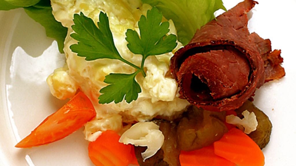 1. Perunasalaatti: Leikkaa perunat kuutioiksi ja sekoita joukkoon kaprikset ja hienonnettu sipuli. Sekoita majoneesi, kermaviili, viinietikka, sinappi, suola ja pippuri kastikkeeksi ja lisää varovasti sekoittaen perunakuutioiden joukkoon.