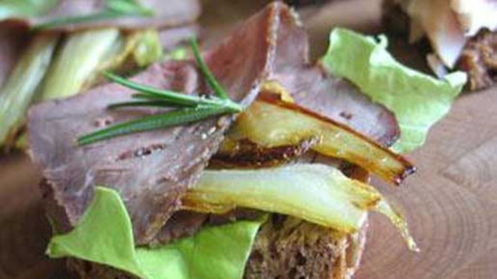 Voitele leipäviipaleet tuorejuustolla ja nostele leivälle salaattia, paahtopaistia sekä fenkolia. Koristele tuoreella rosmariinilla.