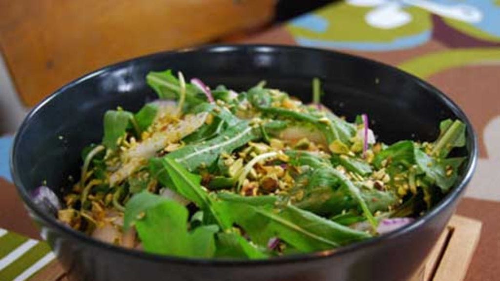 Kuori päärynä, poista siemenkota ja kuutioi hedelmäliha. Leikkaa sipuli ohuiksi puolirenkaiksi. Sekoita ne ja lisää mukaan kevyesti murskatut pistaasipähkinät ja punaviinietikka. Sekoita hyvin. Lisää mukaan rucola ja versoja. Mausta salaatti lopuksi oliivi- ja pähkinäöljyllä.