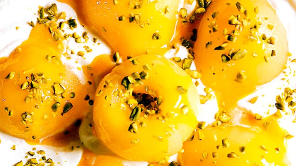 3. Lisää päärynät kermavaahtoon, kaada päälle kastike ja ripottele päälle pistaasirouhe.