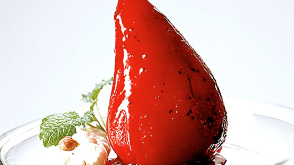 2. Kuori päärynät ja keitä ne pehmeiksi alhaisella lämmöllä herukkakastikkeessa. Tarjoile lämpimien tai haaleiden päärynöiden kanssa kastiketta, jäätelö ja pähkinärouhetta. Koristele sitruunamelissalla.