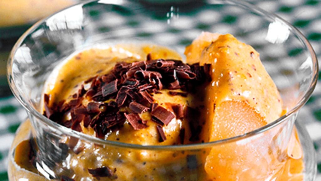 4. Vatkaa kerma ja lisää kastikkeeseen. Kaada kastike päärynöille, koristele suklaalla.