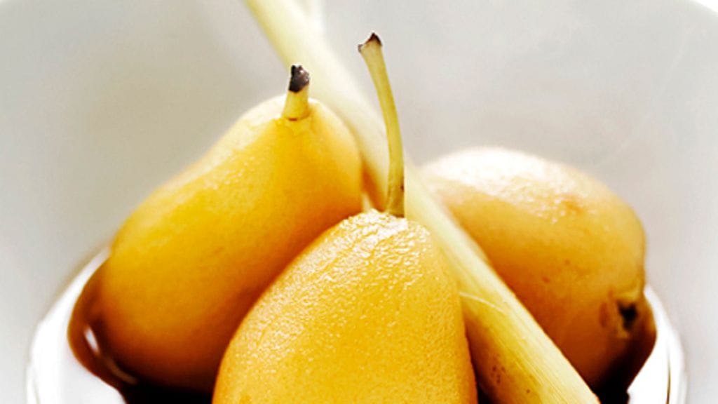 1. Kuori päärynät, mutta säästä kannat. Murskaa sitruunaruohojen alaosa ison veitsen varrella. Pane sitruunaruohot ja päärynät kattilaan ja kaada jäätee päälle. Teen täytyy peittää päärynät kokonaan, joten katso sopivankokoinen kattila.