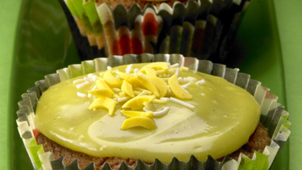 Kuppikakkujen maun ja ulkonäön kruunaa makoisa kuorrutus. Pääsiäisen kunniaksi kuorrutuksesta tehdään pirteän keltainen, mutta voit myös muunnella kuorrutusta kevään muihin juhliin.