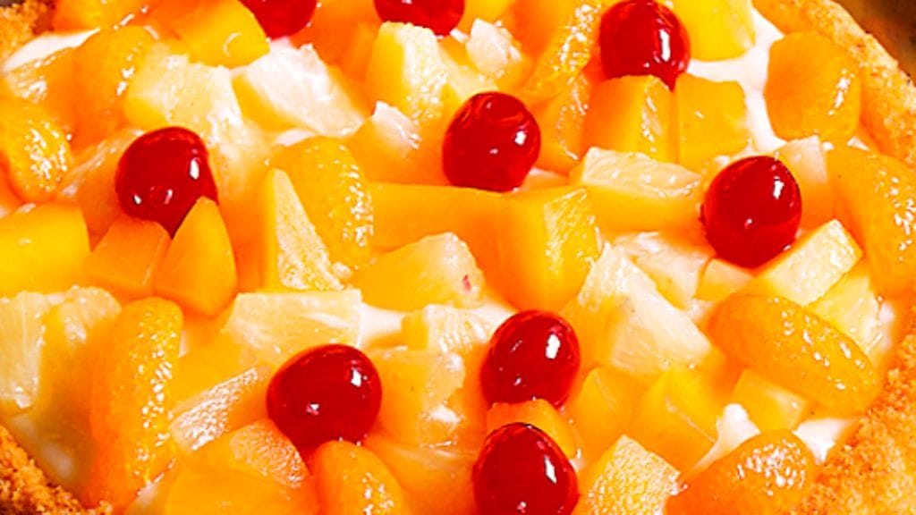 3. Levitä vaniljakiisseli tortun päälle ja jaa hyvin valutetut hedelmät päälle. Lusikoi jäähtynyt hyytelöliemi hedelmien päälle ja siirrä jääkaappiin hyytymään.