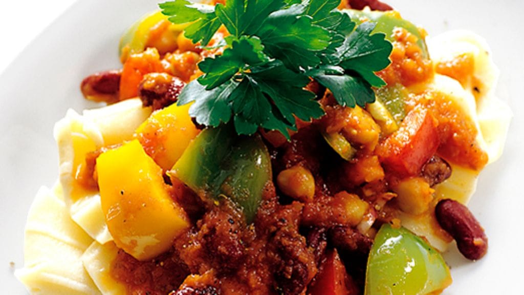 2. Kuori ja silppua sipuli ja valkosipuli. Leikkaa paprikat isohkoiksi paloiksi. Kuullota sipuli ja valkosipuli paistinpannulla. Lisää kikherneet, kidneypavut, paprikat ja tomaattimurska.