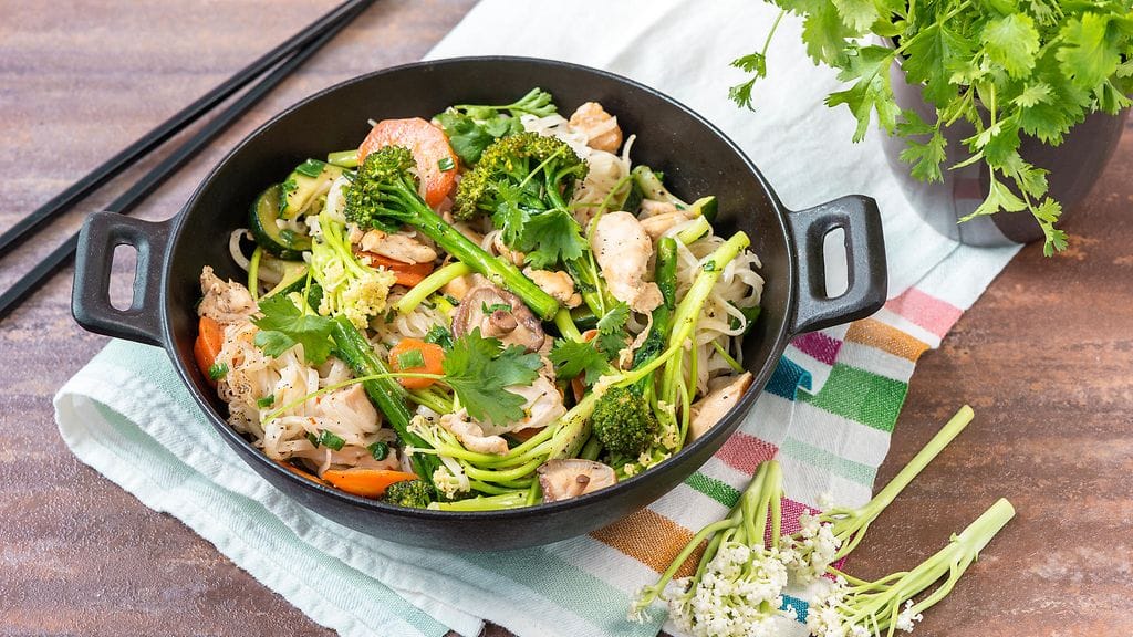 Kuumenna öljy isolla wokkipannulla ja paista broilerinfileesuikaleet kauttaaltaan ja mausta suolalla. Lisää kaikki kasvikset ja kääntele hetki.
