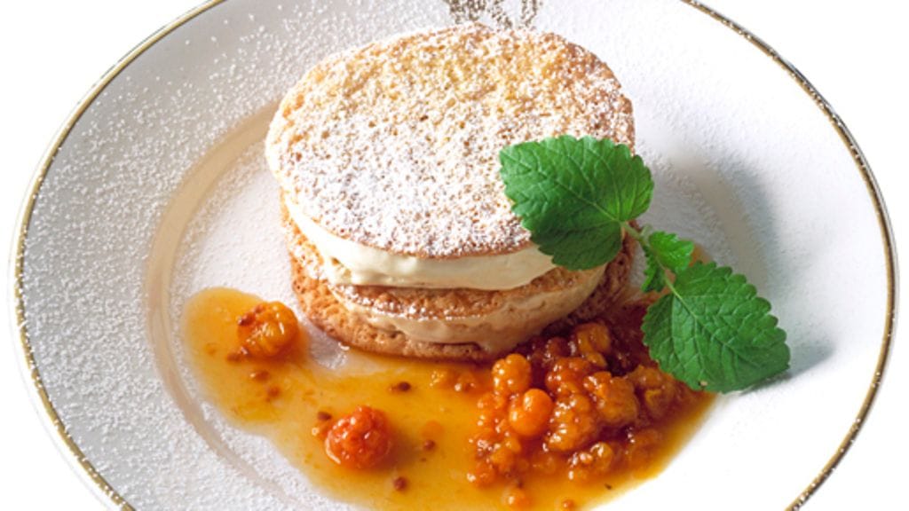 1. Kuumenna uuni 200 asteeseen. Vaahdota kerma. Vatkaa keltuaiset ja sokeri vaaleaksi, ilmavaksi vaahdoksi. Sekoita joukkoon lakkahillo, likööri ja kermavaahto. Jaa seos kahteen, vähintään 3 cm syvään kakkuvuokaan (halkaisija 20 cm). Pane vuoat pakastimeen 3 tunniksi. Jos haluat valmistaa leivoksia, jäähdytä seos 8 pyöreässä annosvuoassa.