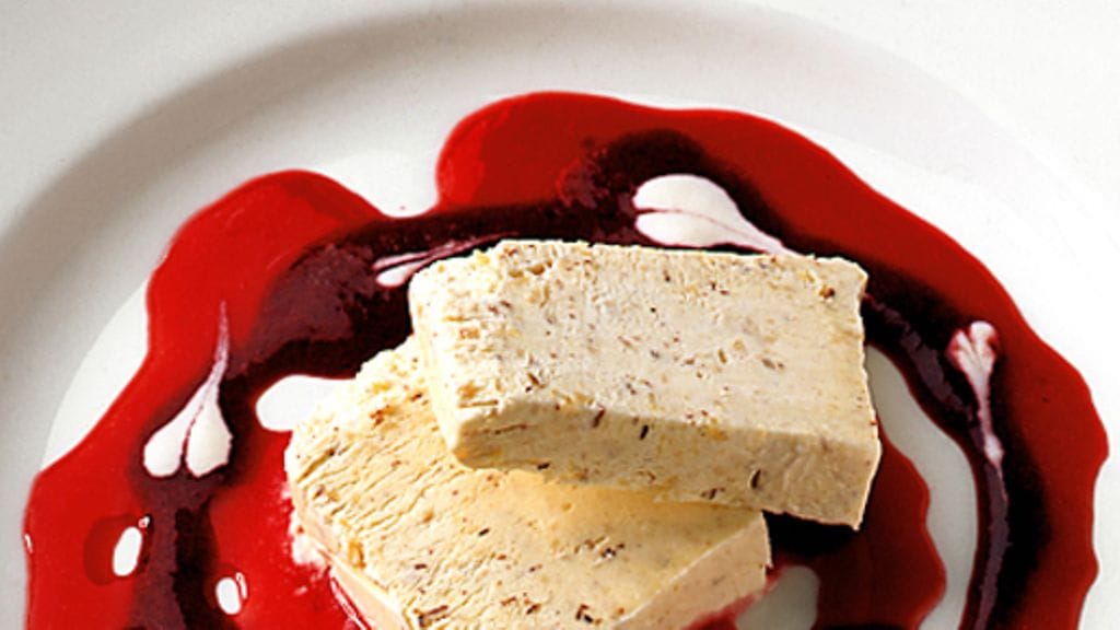 2. Vatkaa munankeltuaiset ja ½ dl sokeria vaaleaksi ja kuohkeaksi vaahdoksi. Vispaa kerma vaahdoksi ja sekoita keltuaisvaahtoon. Vatkaa munanvalkuaiset kovaksi vaahdoksi ja kääntele se varovasti edellisiin vaahtoihin. Lisää sekoittaen mantelijauhe sekä likööri. Kaada seos pyöreään irtopohjavuokaan, jonka läpimitta on n. 24 cm. Peitä kelmulla ja laita pakastimeen vähintään 6 tunniksi. Ota sulamaan hieman ennen tarjoilua.