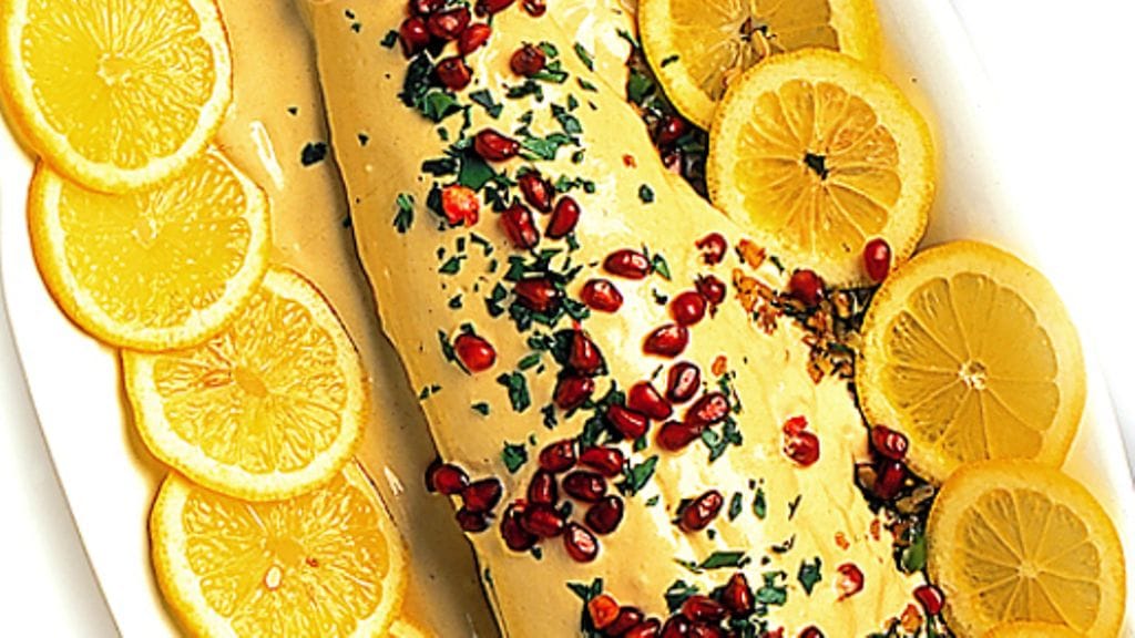 1. Sulata kala lähes kokonaan. Kuumenna uuni 200 asteeseen. Hiero kalan sisään kaksi teelusikallista suolaa ja kaada päälle desilitra öljyä Kuori ja hienonna sipuli. Kuutioi paprika. Rouhi saksanpähkinät. Kuumenna jäljelle jäänyt öljy pannulla. Lisää sipuli ja kuullota koko ajan sekoittaen. Lisää joukkoon paprikakuutiot ja pähkinärouhe. Kypsennä, kunnes paprikakuutiot ovat pehmenneet. Lisää 1½ dl persiljaa, 2 rkl granaattiomenan hedelmälihaa sekä mustapippuri ja jäljellä oleva suola.
