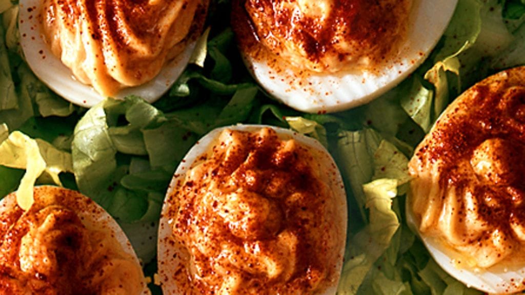 3. Sekoita keltuaisiin kermaviili, majoneesi, sinappi ja suola. Täytä munanvalkuaiset keltuaisseoksella, täytettä on enemmän kuin arvaatkaan. Ripottele päälle paprikajauhetta. Tarjoile munat heti jos haluat, ne voi myös tarjoilla kylminä.