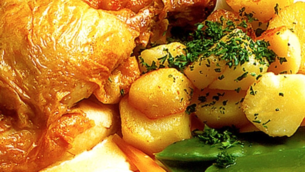 2. Ruskista broileri voissa ja kypsennä sitten uunissa. Kypsennyksen aikana käännä broileri kyljeltä toiselle ja lopuksi rintapuoli ylöspäin. Pistä haarukalla koipipalan paksuimpaan kohtaan. Jos lihaneste on kirkasta, broileri on kypsä. 1,2 kiloa painava broileri kypsyy noin 40-45 minuutissa. Paloittele broileri neljään osaan - kahteen koipi- ja kasteen rintapalaan. Pidä palat lämpiminä.