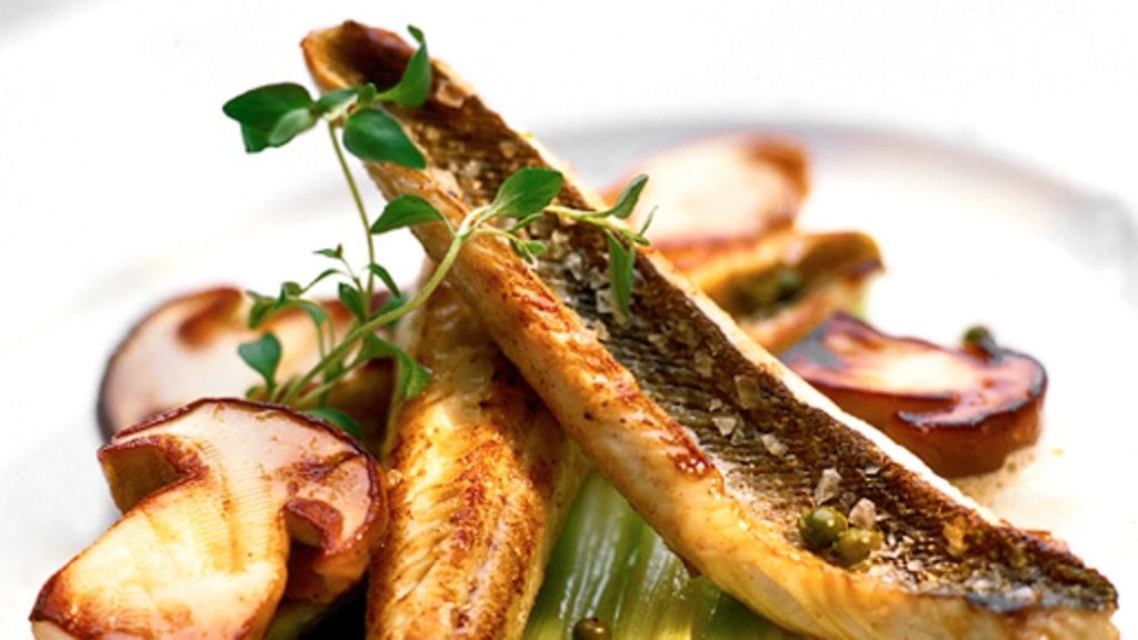 3. Asettele purjot lautasille, kalaa ja sieniä päälle, ympärille kastiketta. Vatkaa mielellään kastiketta kuohkeaksi ennen tarjoilua. Tarjoile vastakeitettyjen perunoiden kera.