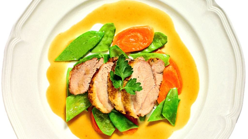 1. Kuumenna uuni 125 asteeseen. Mausta ankanrinnat timjamilla, suolalla ja pippurilla, ruskista ne joka puolelta voissa ja jälkipaista uunissa 15 minuuttia. Sisälämpötilan tulee olla 67 astetta.
