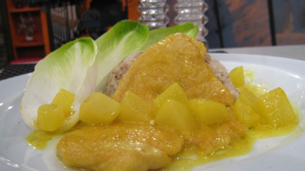 Sekoita vehnäjauhoihin hiukan currya ja pyöräytä broilerinrinnat seoksessa. Paista ne pannulla molemmin puolin mausteöljyssä ja nosta pois pannulta.