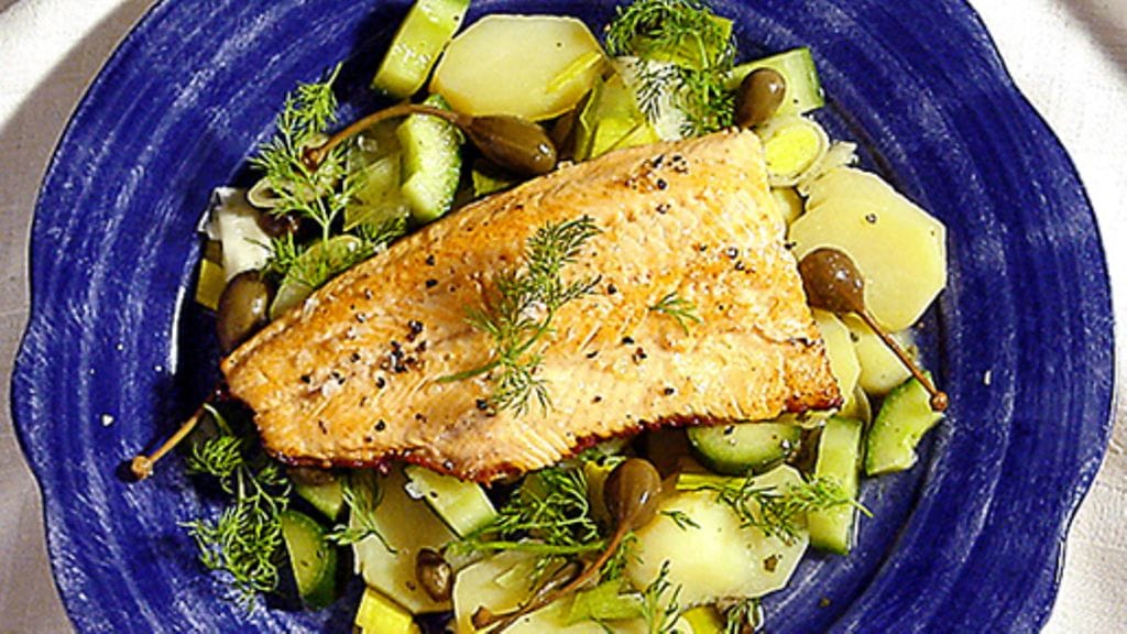 3. Valmista sillä aikaa kala. Penslaa fileet rapsiöljyllä. Paista muutama minuutti molemmin puolin. Koristele pata tillillä ja kapriksilla. Tarjoile pata kalan, vihreiden herneiden ja sitruunalohkojen kera.