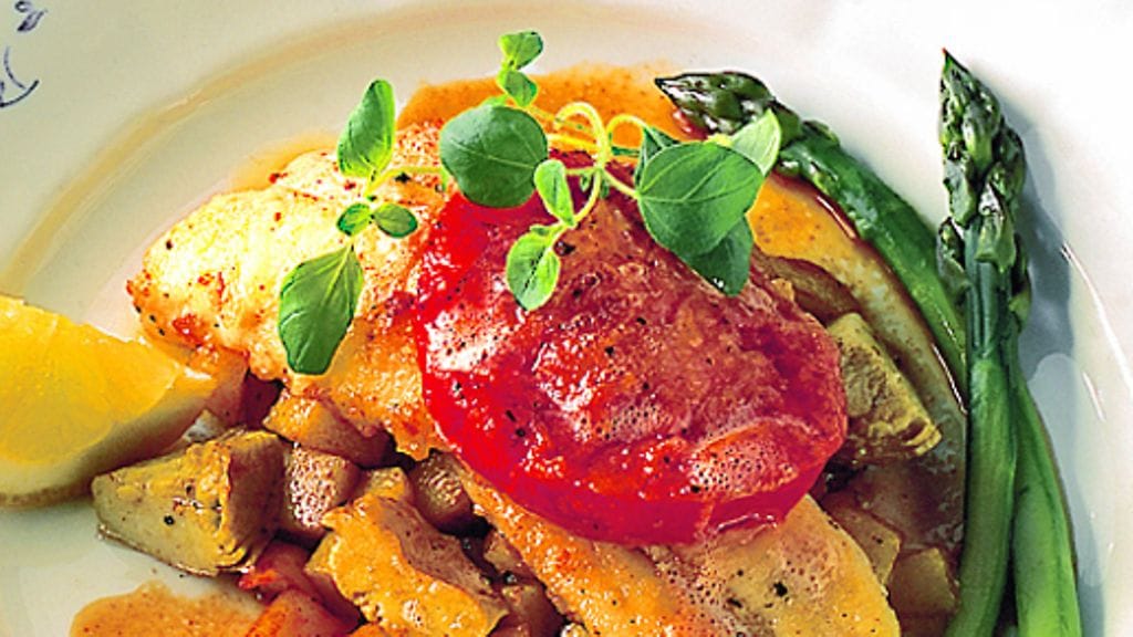 3. Jaa peruna- ja artisokanpohjakuutiot fileiden ympärille ja aseta tomaattiviipaleet niiden päälle. Ripota pinnalle hieman sitruunamehua sekä persiljasilppua ja kaada annokselle ruskistettua voita. Tarjoile heti keitetyn parsan ja sitruunalohkojen kera. Koristele mausteyrteillä.