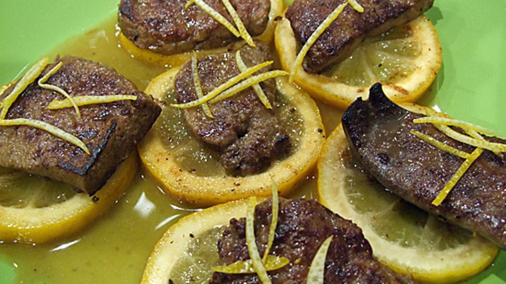 Sulata nyt pannussa voi ja paista siinä sitruunasiivuja kummaltakin puolelta kunnes ne saavat vähän väriä. Nosta maksapalat sitruunasiivuille, kaada pannuun valkoviini, laita kansi päälle ja anna hautua kaksi minuuttia.