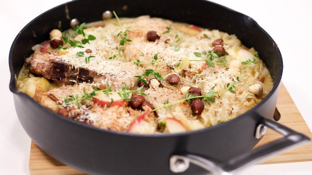 Mausta kyljykset molemmin puolin suolalla ja mustapippurilla. Suikaloi sipulit ja hienonna valkosipulinkynnet. Poista omenoista kota ja leikkaa myös ne 4 osaan. Kuumenna öljy pannulla ja paista kyljyksiä noin 2 minuuttia per puoli, kunnes saaneet kauniin värin. Nosta kyljykset sivuun odottamaan. Lisää pannulle tilkka öljyä. Lisää sipulit ja omenat ja paista muutama minuutti kunnes kasvikset ovat saaneet väriä. Mausta kevyesti suolalla ja mustapippurilla. Sekoita kanaliemi ja dijon-sinappi keskenään ja kaada seos pannulle. Kiehauta ja hauduta noin 5 minuuttia kunnes omenat ja sipulit ovat kypsyneet. Lisää kyljykset ja tuoreet yrtit pannuun. Hauduta vielä noin 20 minuuttia. Viimeistele annokset paahdetuilla hasselpähkinöillä.